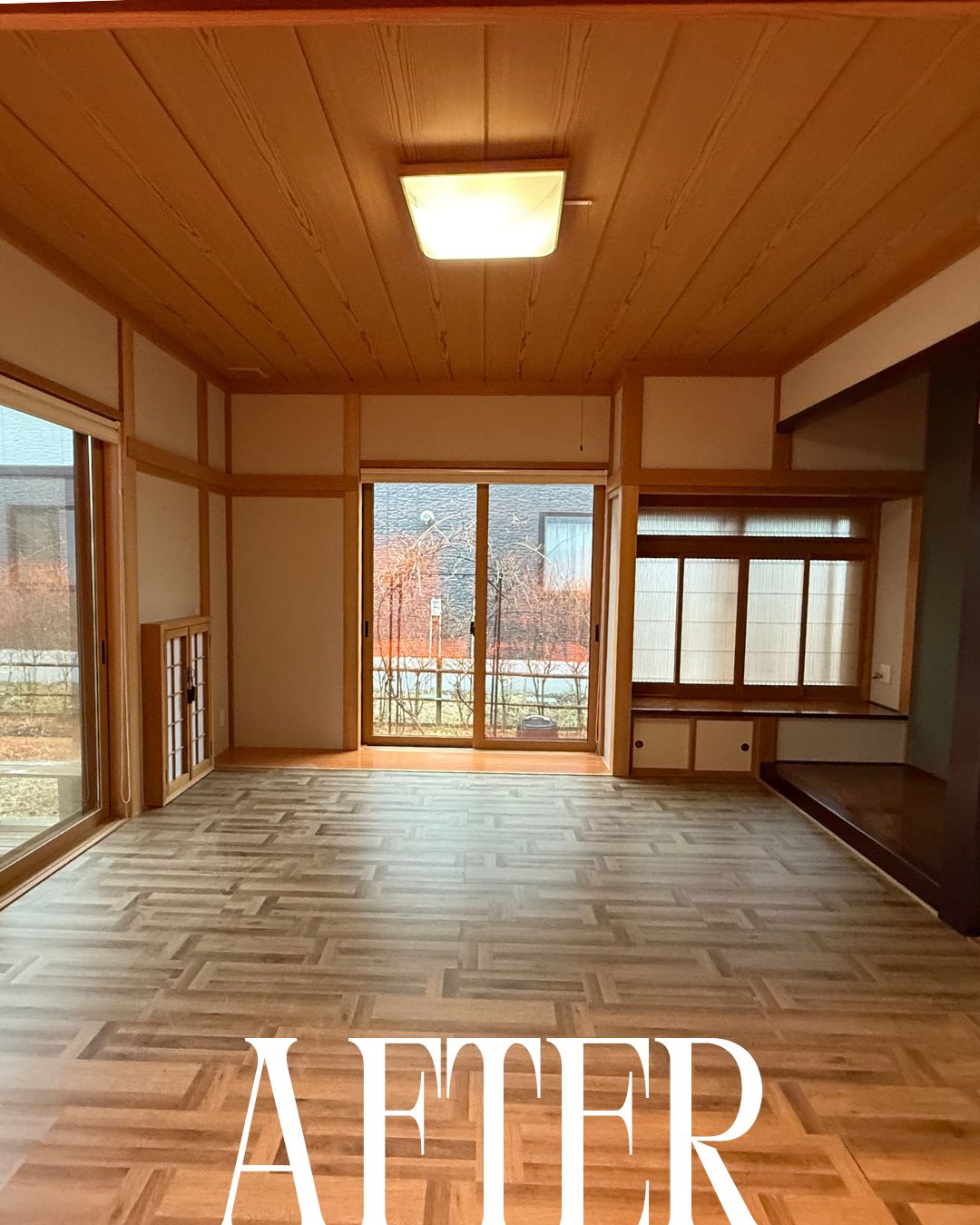 今月お引渡し予定の中古住宅。畳のお部屋をフローリングにしてみたのですが、散々過去にもそうした事例はアパートなどでも見てきて何だか違和感しか感じなかったのですが、今回リクシルDフロアのパーケット調を選択してみましたところ、これはいけるかも・・・と思いました。インダストリアル系の家具なんかを置いても合いそうで成功したと感じました(^^)